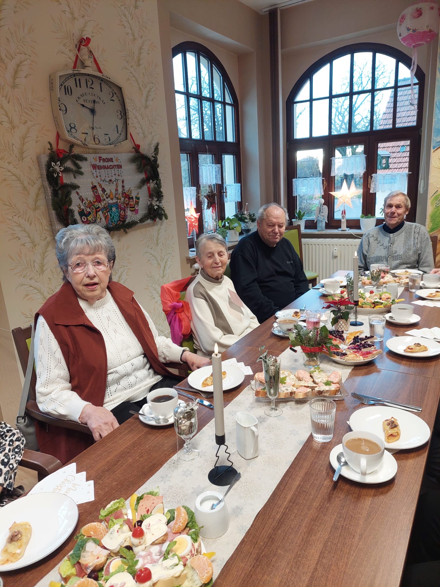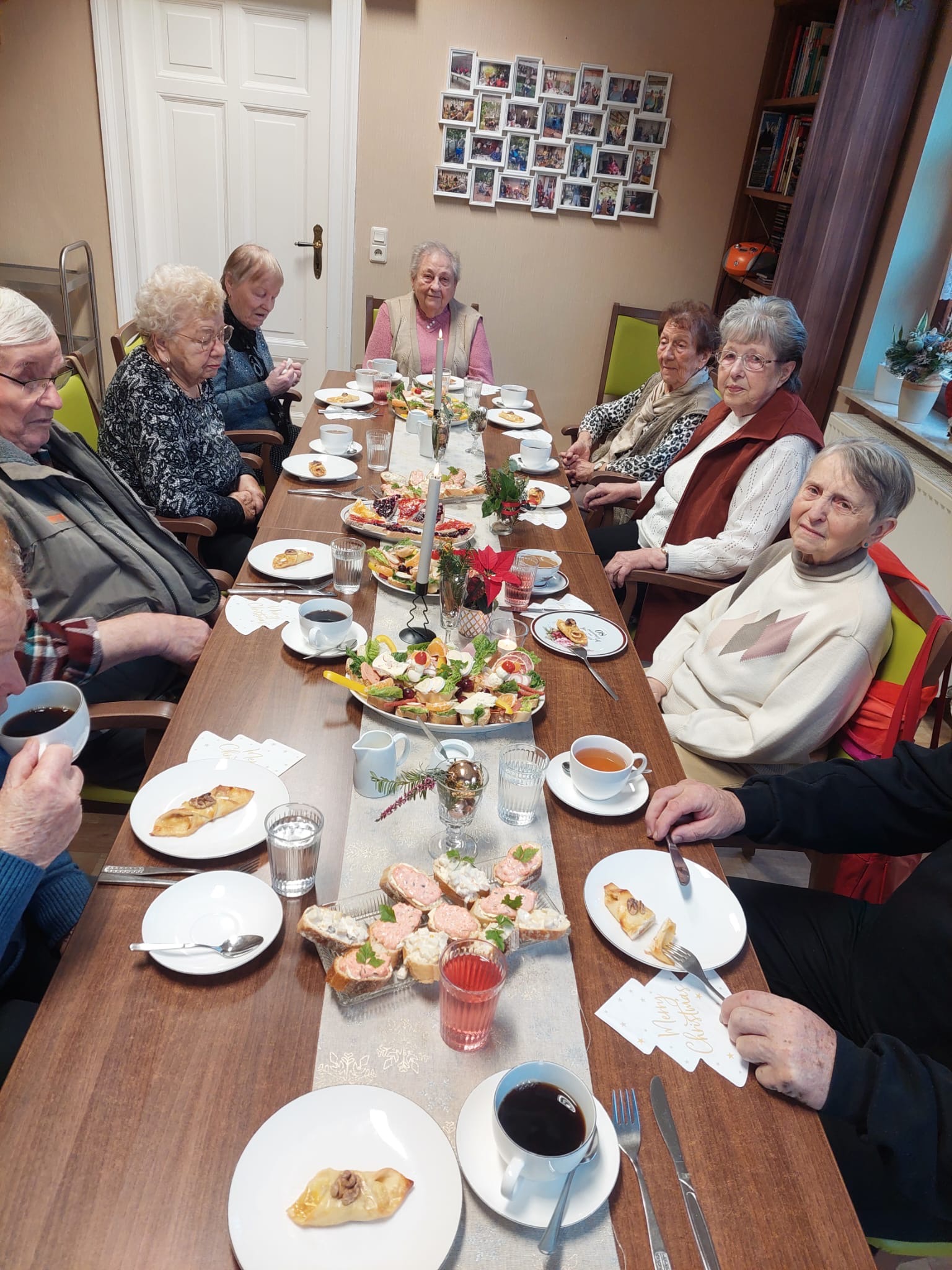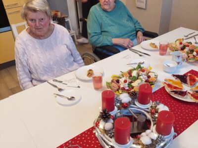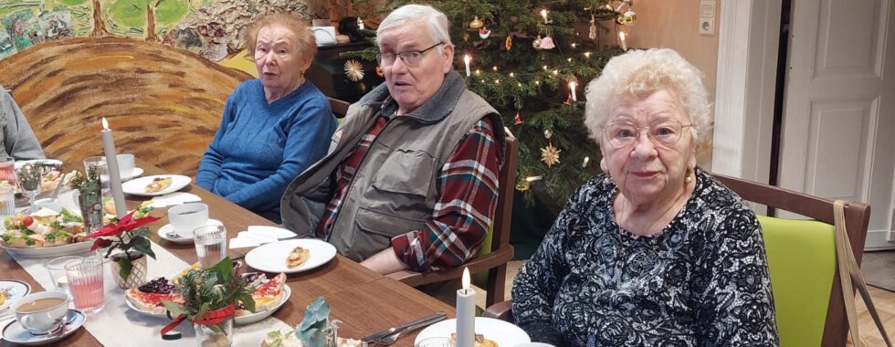 Unser liebevoll geschmückter Aufenthaltsraum mit strahlendem Weihnachtsbaum schafft eine warme, besinnliche Atmosphäre. An festlich gedeckten Tischen genießen unsere Seniorinnen und Senioren kleine weihnachtliche Leckereien, begleitet von leiser, stimmungsvoller Musik.