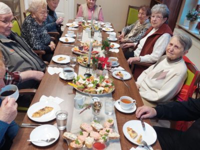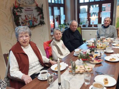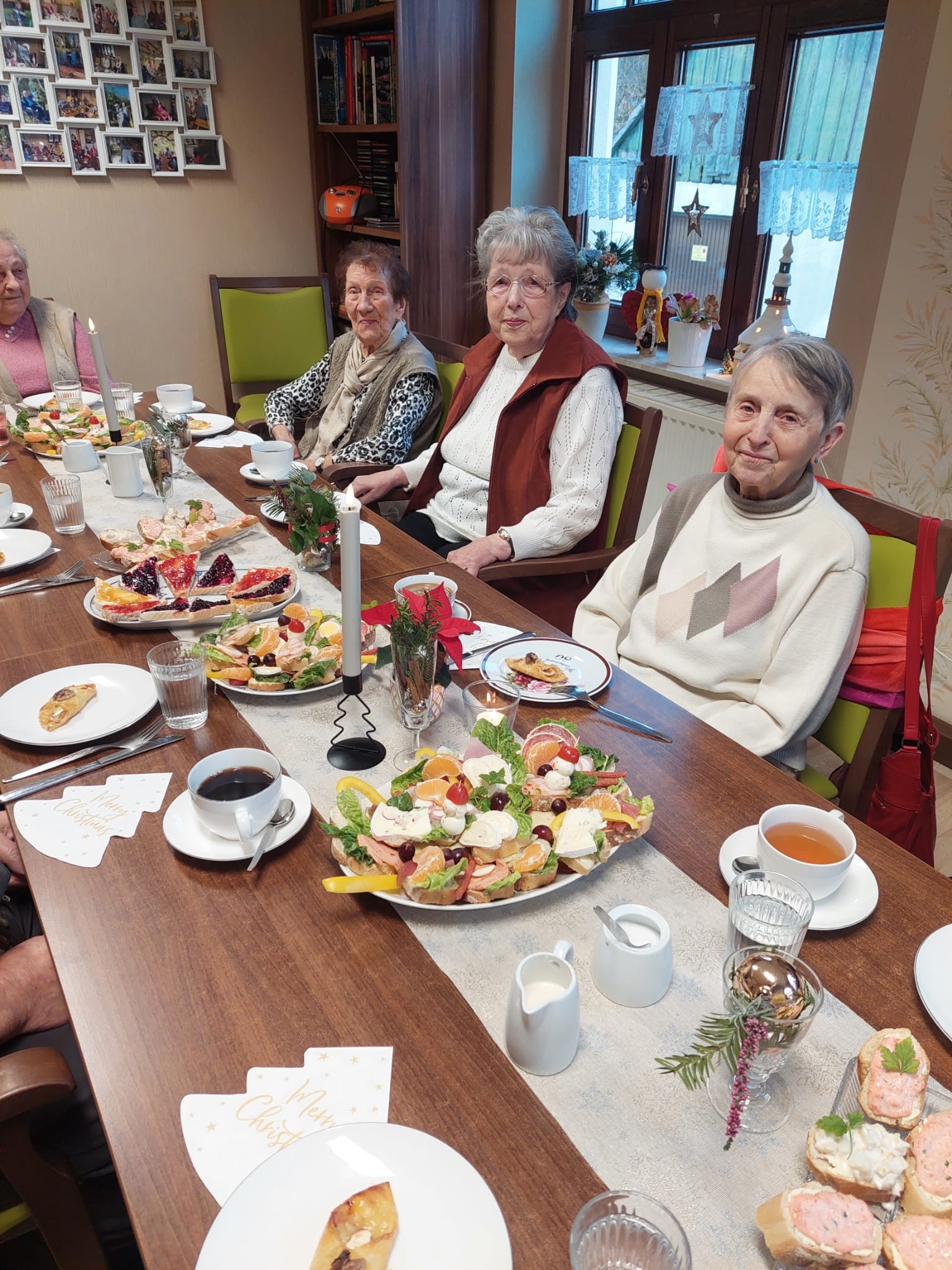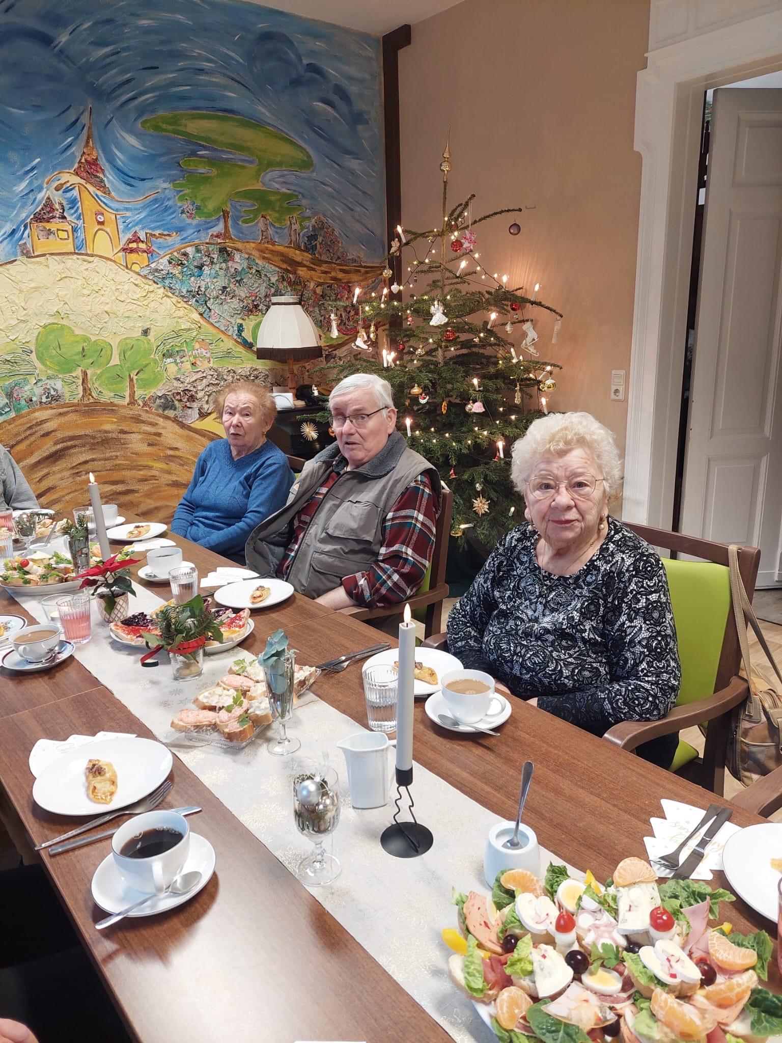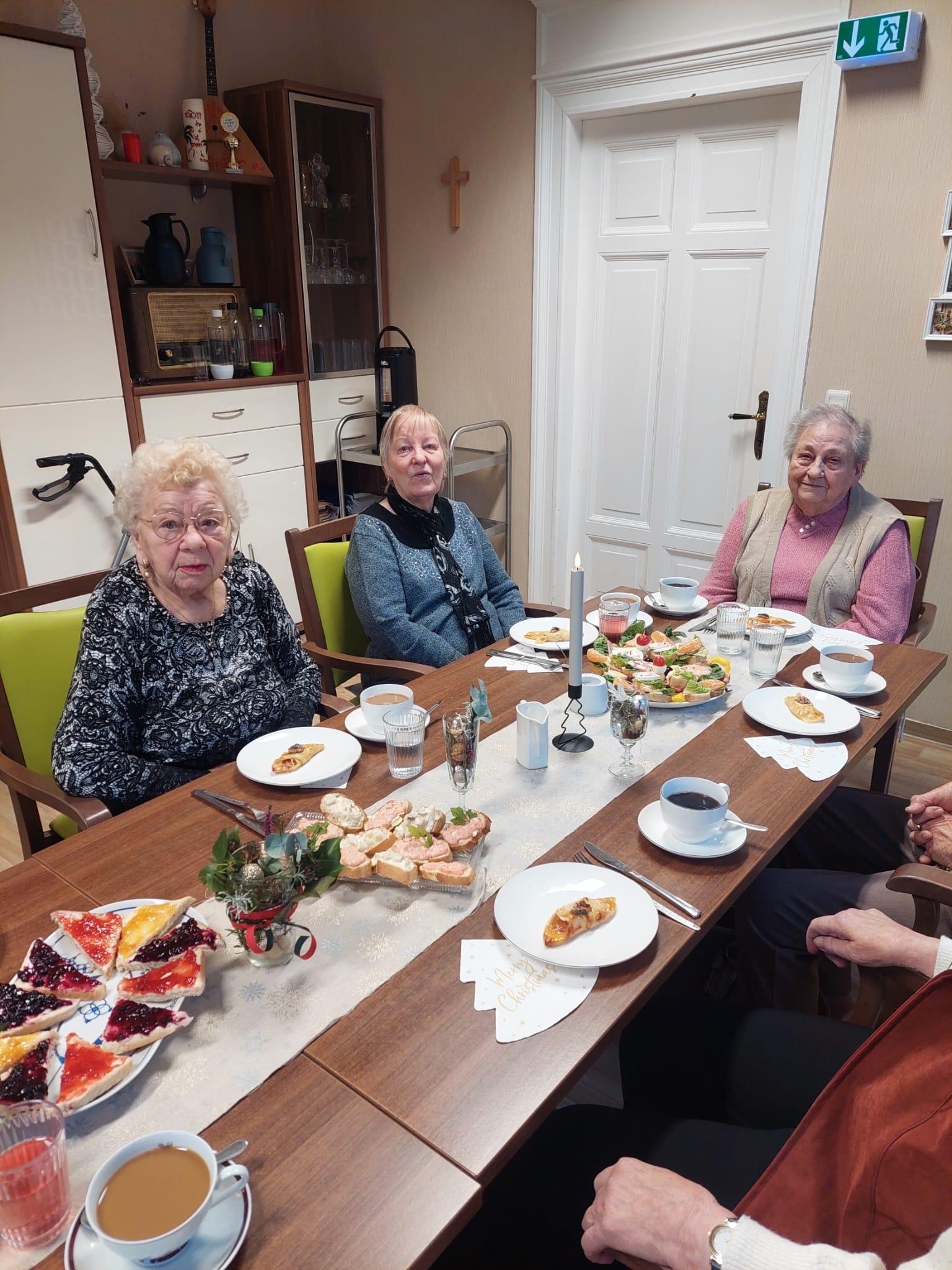 Unser liebevoll geschmückter Aufenthaltsraum mit strahlendem Weihnachtsbaum schafft eine warme, besinnliche Atmosphäre. An festlich gedeckten Tischen genießen unsere Seniorinnen und Senioren kleine weihnachtliche Leckereien, begleitet von leiser, stimmungsvoller Musik.